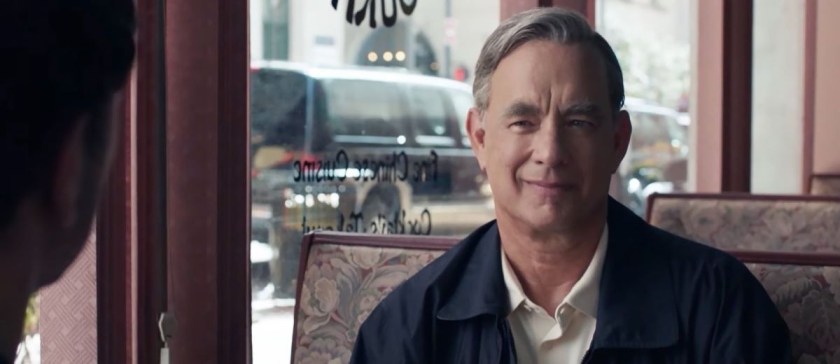 My absolute favorite choice that the film makes is framing the entire story as an episode of Mr. Roger’s Neighborhood. Heller uses the 4:3 ratio when we are in the “show”, and the usual widescreen for the moments in the film. It is one of the best uses of the ratio I’ve seen, and it really gives Hanks the opportunity to be the iconic figure that is Mr. Rogers. The movie opens the way the show did, as Rogers enters the set and changes from business to casual – blazer to cardigan and dress shoes to sneakers – and introduces us to the theme of the episode. We will be looking at his friends, and one friend in particular: Lloyd. This choice makes this movie stand out amongst biopics and allows for the theme and character of Rogers to truly shine throughout the film.