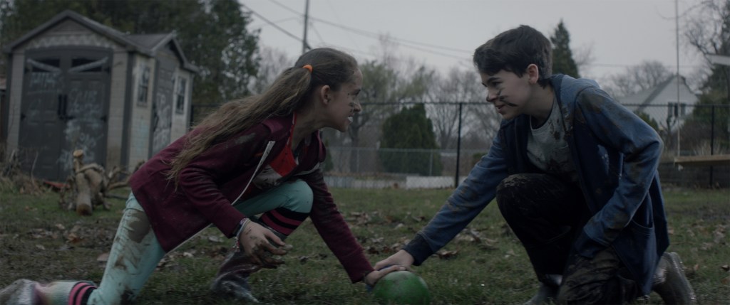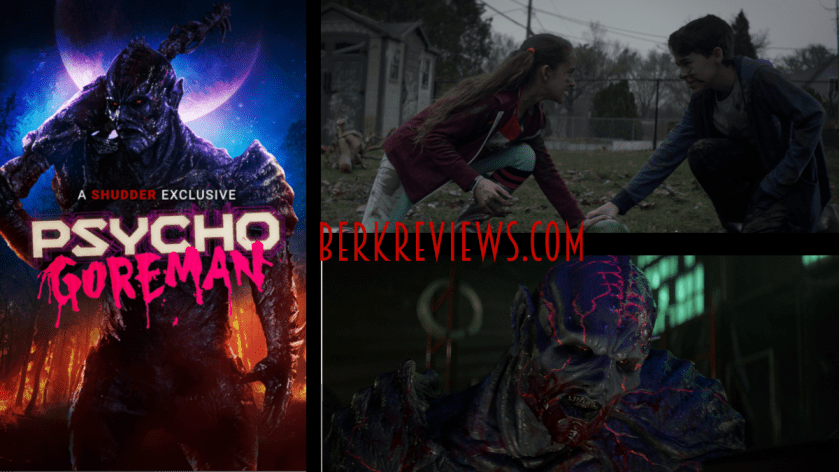 Psycho Goreman (2020) opens with Mimi (Nita-Josee Hanna), and her brother, Luke (Owen Myer), playing Crazy Ball. No, it’s not just a name. The comedic amount of rules and odd moments built into the game quickly establishes the quirky tone that writer and director Steven Kostanski has in store for his audience. Luke’s digging a hole in the back yard leads to the siblings discovering a glowing gem that Mimi claims as her own. After the two have gone to bed, a monster arises from the hole and kills a group of thieves hiding out in an abandoned factory near their house.